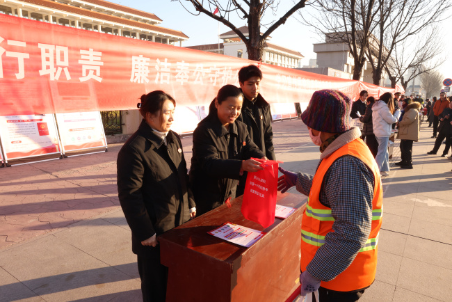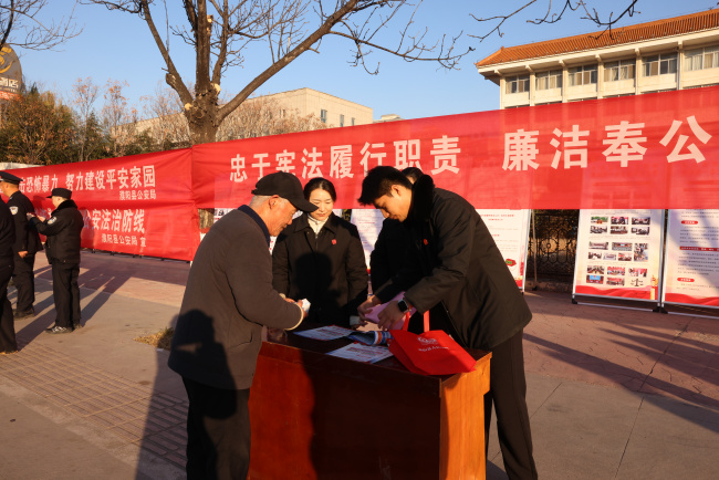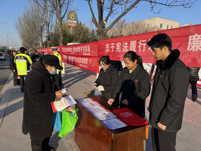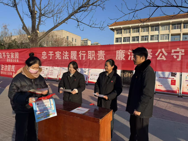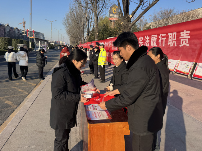 县政府门口西侧,濮阳县法院干警通过悬挂横幅、发放宣传单页、讲解普法展板等方式,向来往群众宣讲宪法精神、宪法赋予公民的各项权利和义务,增强群众法治意识。现场还为群众提供法律咨询服务,围绕《民法典》中关于物业纠纷、婚姻家庭、劳动争议、防范电信诈骗等内容进行重点解读。不少群众驻足咨询,就自己遇到的法律难题向干警提问,现场气氛热烈。