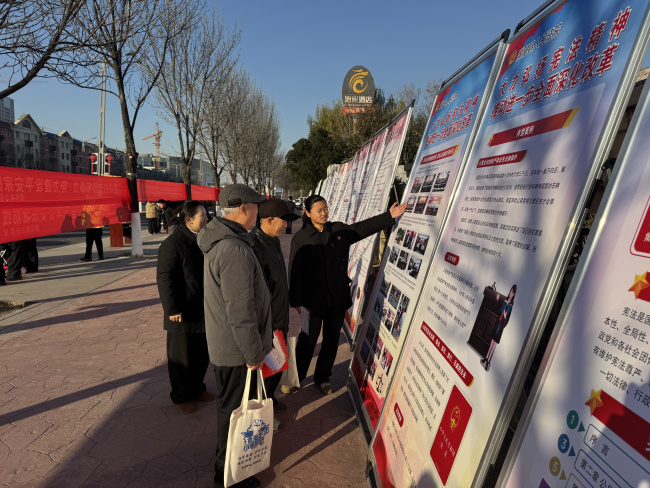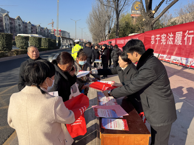 胡状镇人民政府院前,胡状法庭干警围绕宪法的主要内容、宪法的地位、宪法的发展历程以及宪法赋予公民的主要权利等方面,向群众进行了详细解读,并向他们发放了宪法相关的宣传资料,引导广大群众牢固树立宪法意识,做到知法于心,守法于行。