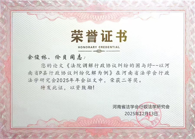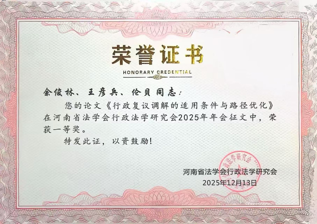 近日,河南省法学会行政法学研究会2025年年会征文评选结果正式公布。该研究会是全省行政法学研究领域的权威学术团体,由业内学者、专家等进行本次征文评选,本次聚焦行政法治实践前沿问题,兼具学术高度与实践价值,在全省法学界具有重要影响力。
