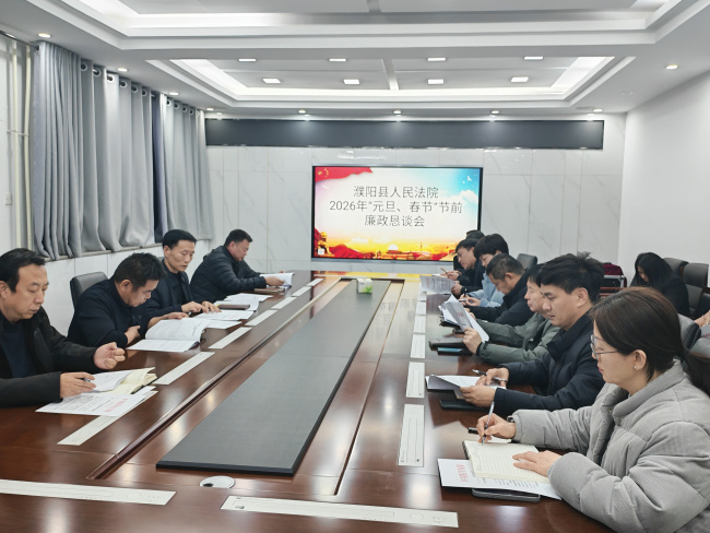 “元旦、春节”将至,为深入贯彻落实全面从严治党要求,进一步增强干警廉洁自律意识,营造廉洁祥和的节日氛围,12月31日,濮阳县法院召开2026年“元旦、春节”节前廉政恳谈会。会议由党组副书记、分管日常工作的副院长佘俊林主持,全体班子成员、各部门负责人参加。