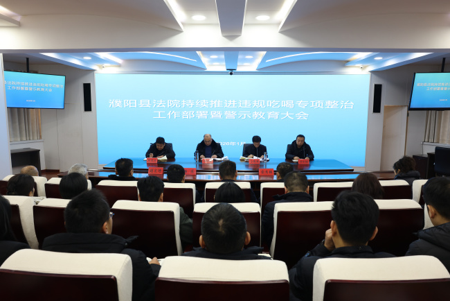 1月26日,濮阳县法院审判条线、执行条线先后召开持续推进违规吃喝专项整治工作部署暨警示教育大会,深入贯彻省政法系统、省法院及相关会议精神,对持续推进违规吃喝专项整治工作进行部署。会议由党组副书记、分管日常工作的副院长佘俊林主持,全体班子成员、部门负责人、员额法官参加会议,党组书记、院长沙国省参加会议并讲话。