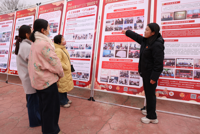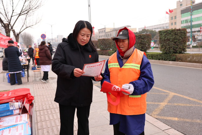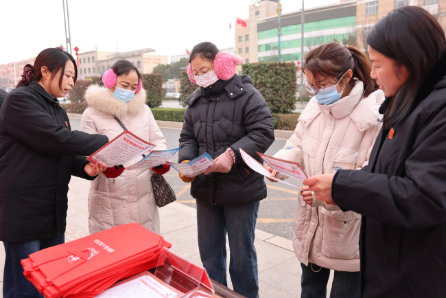 县政府门口西侧,濮阳县法院干警通过悬挂横幅、发放宣传单页、讲解普法展板等方式,用通俗易懂的语言,围绕妇女人身和人格权益、财产权益、婚姻家庭权益等群众关心的热点问题,向群众重点宣传《中华人民共和国民法典》《妇女权益保障法》《反家庭暴力法》等法律法规,有效提升妇女群众的法律意识和依法维权能力。